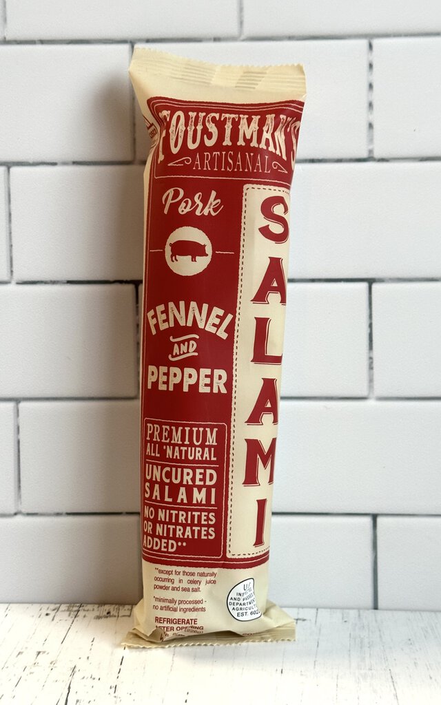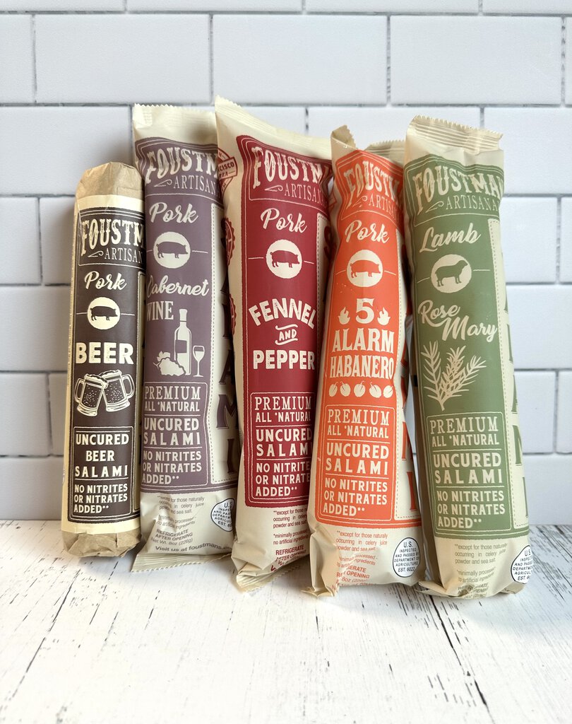 Foustman's Artisanal Italian dry salami is cured using traditional techniques passed down from Old Country and kept alive by dedicated salumists in the San Francisco Bay Area. A beneficial, edible mold bloom may be visable on casing. Please remove casing before eating. Enjoy!